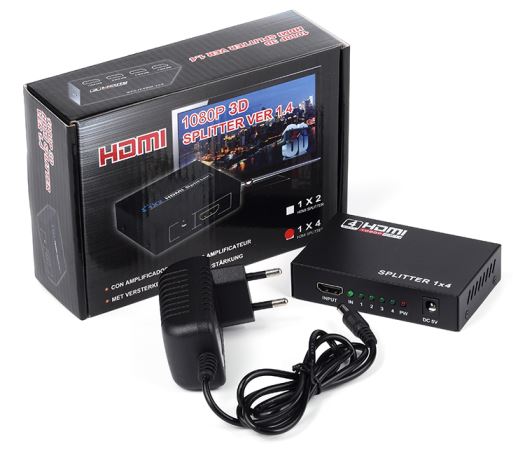 1分4 HDMI分配器可将一个HDMI信号源连接至多个HDMI输出口,从而轻易地将单个HDMI设备的信号分配