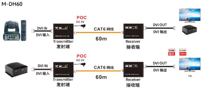 5、信号传输:一条cat5或者cat6线(推荐使用)替代DVI线,接收器和发射器之间线缆最长可达60米