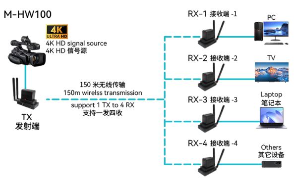 M-HW100无线图传通过5.8G无线WIFI信号传输高清音视频信号,最高支持4K@60Hz 分辨率,能够适应多种复杂的应用环境。该设备拥有卓越的图像处理和传输能力,使信号传输更加流畅和稳定,是一种可靠、高性能、高效的HDMI信号延长方式。